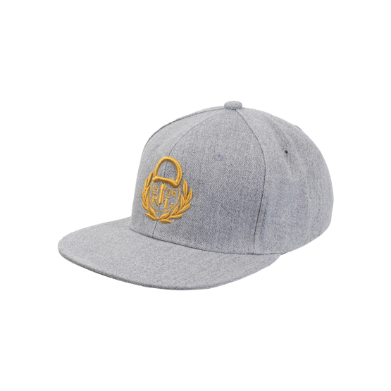 Harmaa snapback, jossa edessä 3D-brodeerattuna keltainen Lukko -logo.