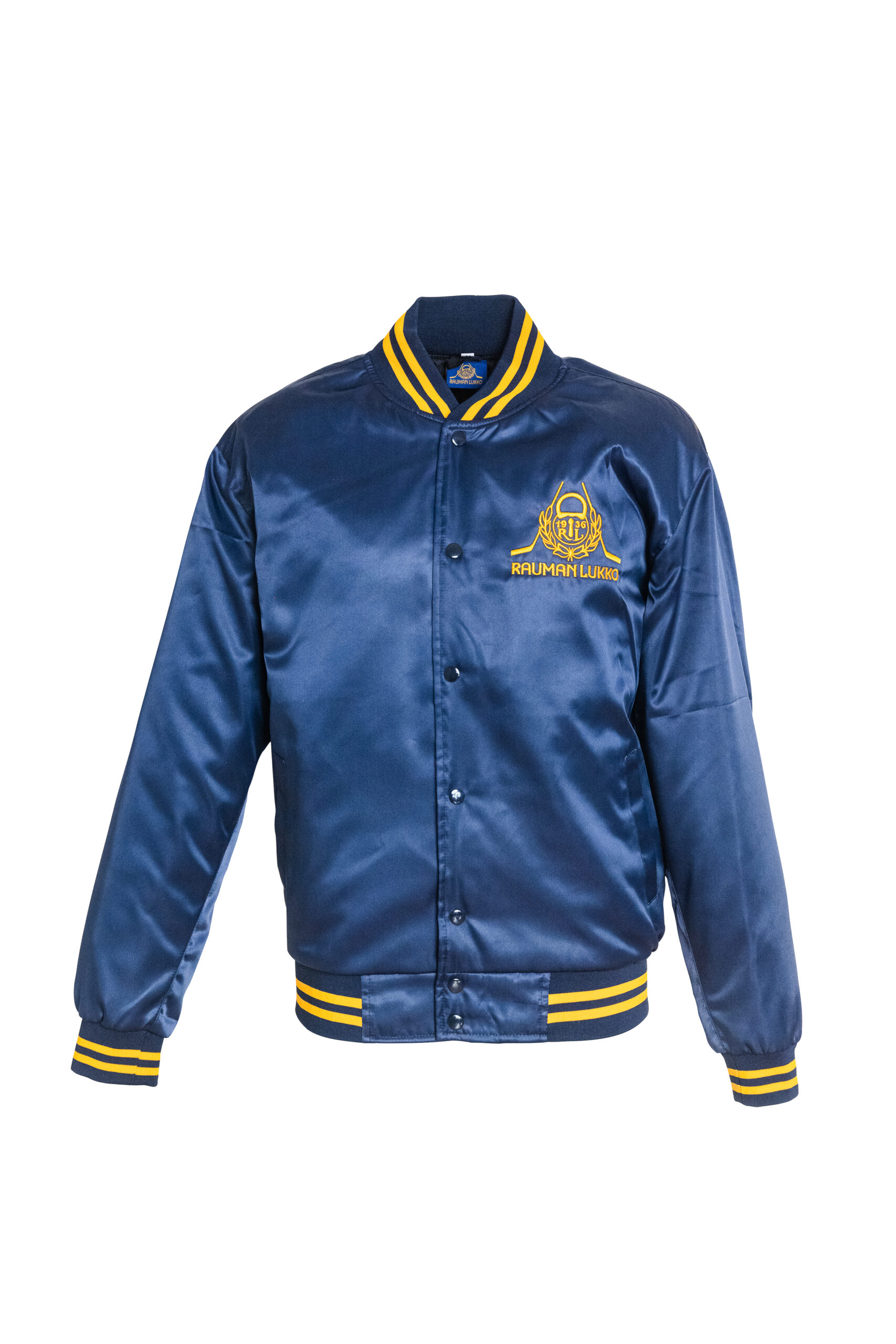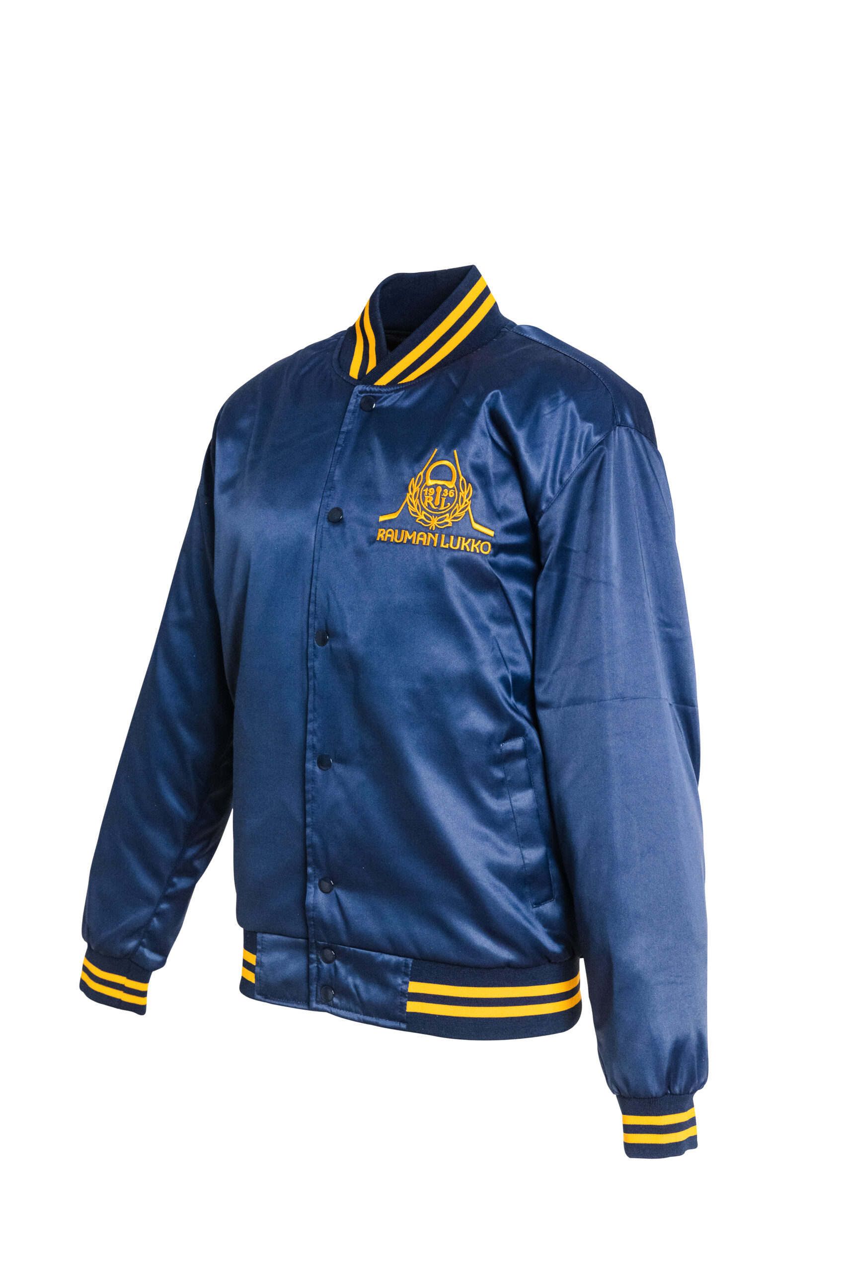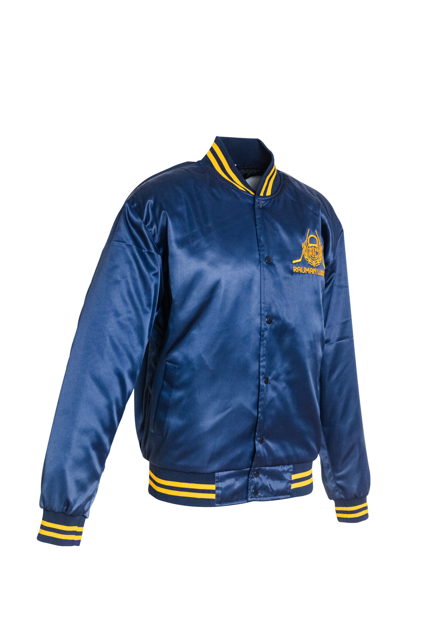 Sininen satiinitakki, jossa rinnassa brodeerattu logo.